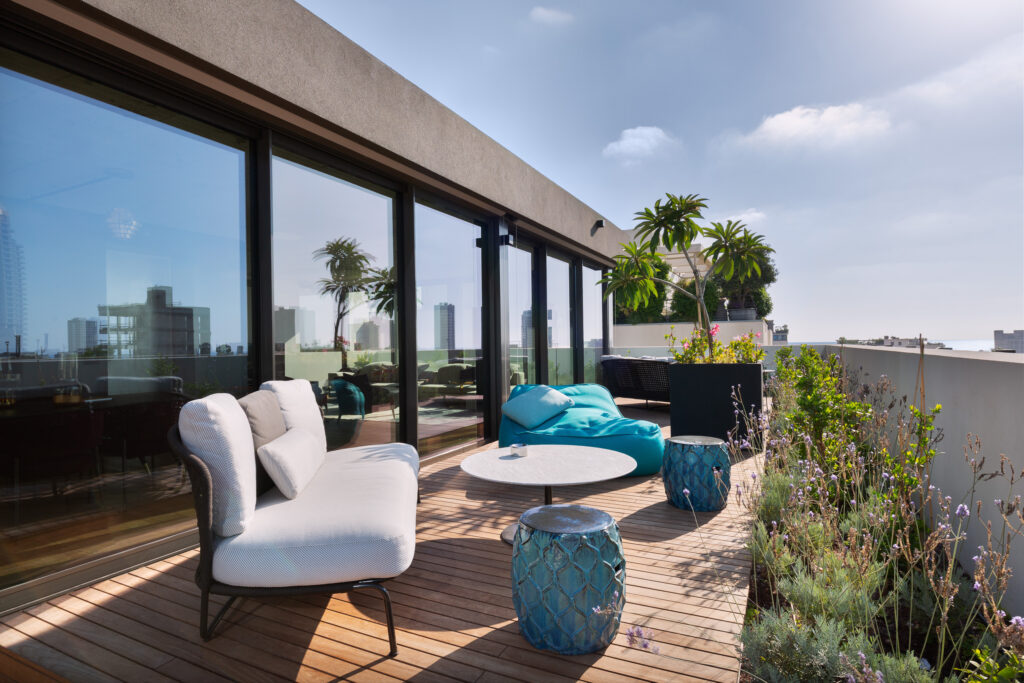 The Architectural Dialogue: My photography of this project focused on the striking contrast between the original UNESCO-recognized facade and the bold, metal-clad penthouse added during the renovation. The interior design, led by Yael Siso, introduces an industrial-chic aesthetic. By capturing the building’s original board-formed concrete and pairing it with sophisticated mid-century furnishings, the visual narrative highlights Tel Aviv’s unique urban “Zeitgeist.”